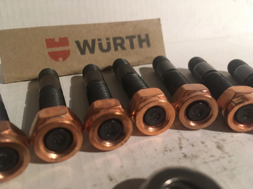 Complete set of 10 genuine Würth extended exhaust manifold studs, supplied with 10 copper-flashed nuts and 10 M8 stainless steel washers, suitable for Land Rover Defender and Discovery 2 TD5 engines.